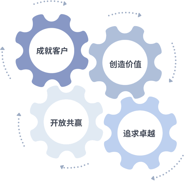 成就客户是一切决策的出发点,,,创造价值是衡量所有工作的标准,,,,追求卓越是我们做事做人的态度,,,开放共赢是我们的格局也是最终的结果。。。价值观的齿轮环环相扣,,,,推动着组织里的每个人不断向前。。。