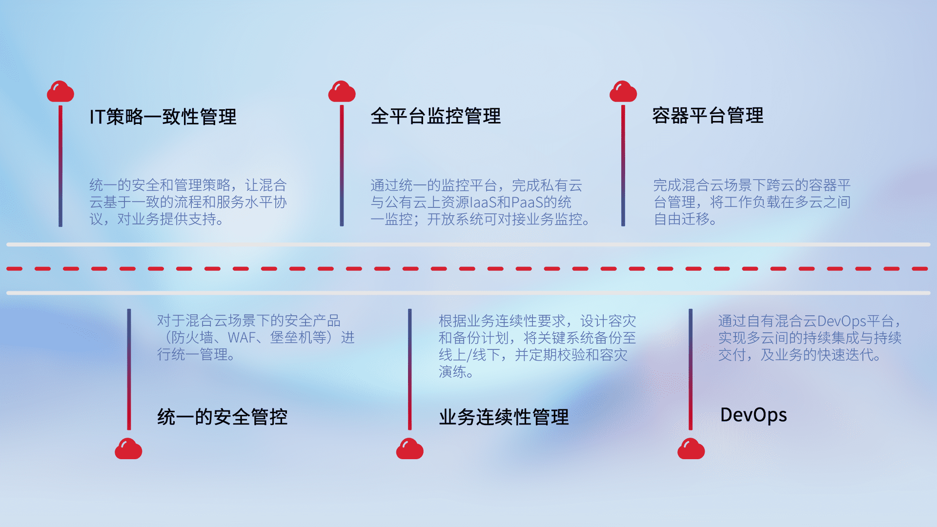 通过多云纳管,,,以统一的资源数据模型把客户的云资源进行抽象和封装,,,进而实现对多云资源的统一操作,,保障云资源管理的可靠性、、、、稳定性与可用性。。。。量身定制化运维内容,,,配置、、、开发运维、、、补丁管理、、备份、、监控、、认证和访问管理、、、、审计和日常巡检等,,,,保障在用云过程中的可靠度,,稳定度以及高可用率。。。
