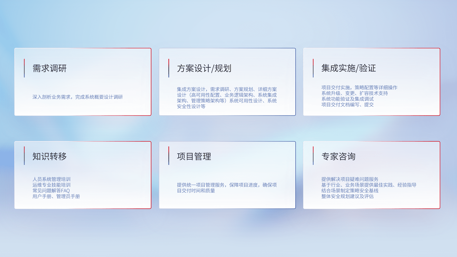 针对客户行业特性,,,将宏观的安全战略和需求,,通过专业的交付服务,,实现项目落地,,,,为客户提供标准规范的集成交付服务。。。